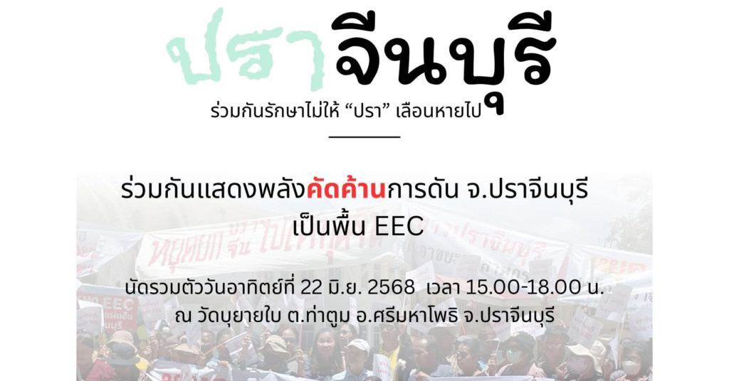 แถลงการณ์ สนับสนุนการเคลื่อนไหวของประชาชนในการคัดค้านการนำจังหวัดปราจีนบุรีเข้าสู่เขตพัฒนาพิเศษภาคตะวันออก (EEC)